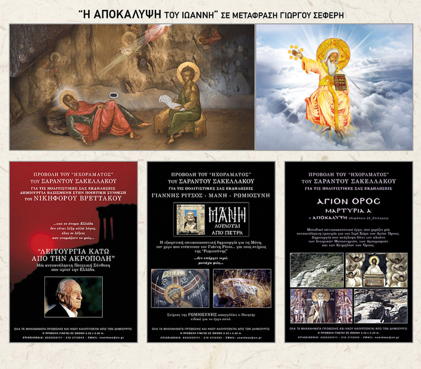“Η ΑΠΟΚΑΛΥΨΗ ΤΟΥ ΙΩΑΝΝΗ” σε μεταγραφή Γεωργίου Σεφέρη (Νόμπελ Λογοτεχνίας 1963) είναι η τελευταία του δημιουργία, το 2019. Έργο το οποίο τιμήθηκε στο XVI Διεθνές Φεστιβάλ Κινηματογράφου της Μόσχας τον Νοέμβριο του 2019 και για το οποίο προσεκλήθη επισήμως και το παρουσίασε, σε ειδική προβολή, στο κοινό της Μόσχας. Σημαντικά σημεία στην καλλιτεχνική του πορεία, η πρόσκλησή του στις ΗΠΑ από τον Αρχιεπίσκοπο Ιάκωβο, όπου παρουσίασε για τα Ελληνικά Γράμματα, τη δημιουργία του “ΛΕΙΤΟΥΡΓΙΑ ΚΑΤΩ ΑΠΟ ΤΗΝ ΑΚΡΟΠΟΛΗ”, στο Ναό της Αγίας Τριάδος, στο Μανχάταν. Επίσης προσεκλήθη και παρουσίασε τα έργα του, στο BUENOS AIRES, από τον Αρχιεπίσκοπο Νοτίου Αμερικής Γεννάδιο, στην 11η ΚΛΗΡΟ-ΛΑΪΚΗ ΣΥΝΕΛΕΥΣΗ ΤΗΣ ΚΕΝΤΡΙΚΗΣ ΚΑΙ ΝΟΤΙΟΥ ΑΜΕΡΙΚΗΣ. Έχει παρουσιάσει ακόμη τις δημιουργίες του σε δύο αρχαία θέατρα. Έχει παρουσιάσει τις δημιουργίες του, σε μεγάλους χώρους τέχνης και Γραμμάτων, όπως: • Στη ΡΩΣΙΑ, XVI Διεθνές Κινηματογραφικό Φεστιβάλ Μόσχας. • Μέγαρο Μουσικής Αθηνών. • Εθνική Πινακοθήκη, Αθήναι. (…με την παρουσία του Ποιητή) ΗΠΑ, New York, Holly Trinity Cathedral. ( Έγιναν συνολικά 4 παρουσιάσεις των έργων του στις ΗΠΑ, σε διάφορες πόλεις) • ΑΡΓΕΝΤΙΝΗ, Buenos Aires. • Δημοτικό Θέατρο Πειραιά. (…με την παρουσία του Ποιητή) • Μέγαρο Παλαιάς Βουλής, Αθήναι. • Πάτρα, Δημοτικό Θέατρο Απόλλων. Εθνικό Μετσόβειο Πολυτεχνείο. (Αμφιθέατρο) Μέγαρο Μελά, Εκδηλώσεις για τον Ποιητή. (Εθνική Τράπεζα Ελλάδος) • Θεσσαλονίκη, Μέγαρο Τράπεζας Ελλάδος. • Πάτρα, Μέγαρο Λόγου και Τέχνης. • Αρχαίο Θέατρο Γυθείου. (…με την παρουσία του Ποιητή) • Αρχαίο Θέατρο Μαντινείας. (..με την παρουσία του Ποιητή) • Τρίπολη, Πνευματικό Κέντρο. • Δήμος Ψυχικού, Πολιτιστικό Κέντρο Μπενετάτου. • Καλάβρυτα, Πνευματικό Κέντρο. • Δίστομο, Εκδηλώσεις μνήμης για το Ολοκαύτωμα της Πόλης. • Αγρίνιο, Πνευματικό Κέντρο. (…με την παρουσία του Ποιητή) και σε πολλές άλλες αίθουσες Τέχνης και Γραμμάτων σε όλη τη χώρα. • Έχουν γραφτεί εξαιρετικές κριτικές για τις δημιουργίες του.